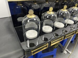 | Glass Dome | Blown and polished, with custom metal knob | Crystal clarity | Protection and elevation of perfume bottles |